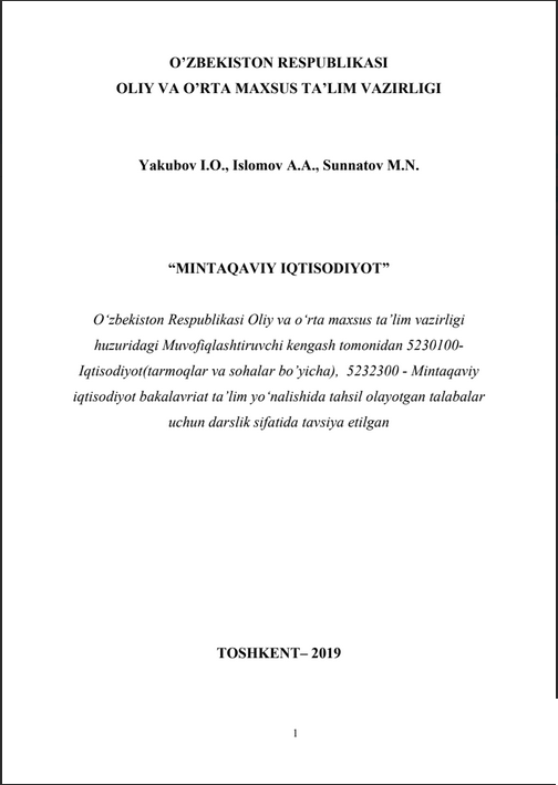 © Yakubov I.O., Islomov A.A., Sunnatov M.N. Mintaqaviy iqtisodiyot: Darslik. –